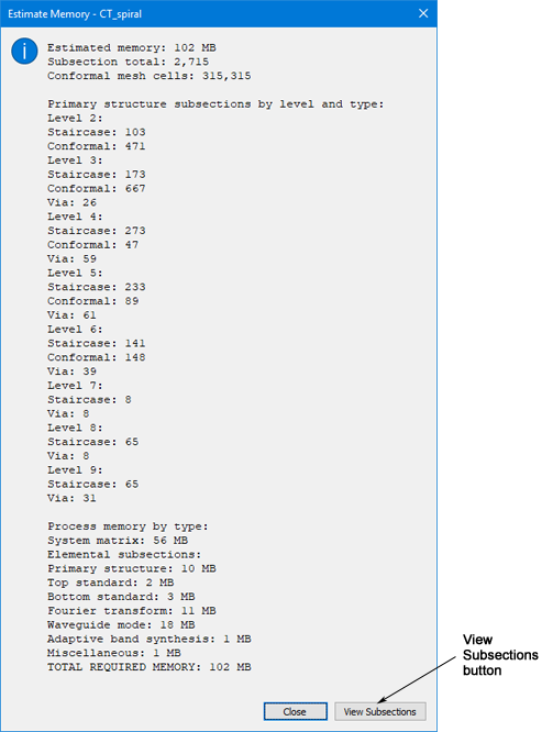 A small message box appears with “Subectioning Circuit” displayed. When the subsectioning is complete, the Estimated Memory dialog box is displayed with statistics on the circuit, including how much memory is necessary to analyze the circuit. When conformal mesh is used, the memory can be significantly reduced out of proportion to the reduction in analysis time. The true time is a function of the subsection total and the conformal mesh cells. So it is possible to have a circuit using conformal mesh that requires the same amount of memory as a circuit without it, but the conformal mesh circuit requires more time. But conformal mesh does reduce the memory requirements and processing time, while achieving the same accuracy, as analyzing the same circuit using staircase fill.