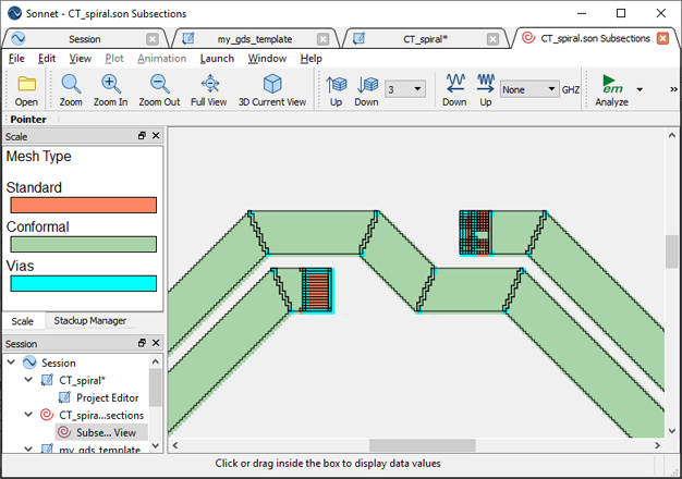 As you can see the areas around the vias are using standard staircase subsections (orange) while the inductor is using conformal subsections (green) where the subsections are larger and conform more closely to the shape of the input polygon. The edges are still a “staircase” shape because the metal fill has to be “on” grid, but the subsections are larger and can be irregular shapes.