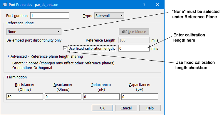 The second column shows how the default calibration length is determined. The third column shows whether a manual setting is possible and if so, how to input the desired length. For example, for standard box-wall ports which have a reference plane, changing the reference plane length changes the calibration standard length. For ports which allow you to change the calibration length, double-click on the port and enter the desired value in the Cal Length text entry box as shown below.