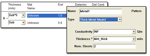Data input windows for dielectric thickness (background) and metal thickness (foreground). You can also control permittivity, conductivity, loss tangents, and other material properties with variables or equations.