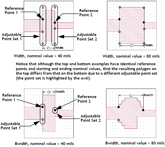 Note that the Anchored Dimension Parameter is always defined as the distance between the Anchor Point and the Reference Point in either the X direction or the Y direction, never as a diagonal distance between them. See Movement of Adjustable Point Sets for advanced options for controlling how the Adjustable Points move when the value of the Dimension Parameter changes. Two examples are illustrated below which use the default setting for how the Adjustable Point Set moves.