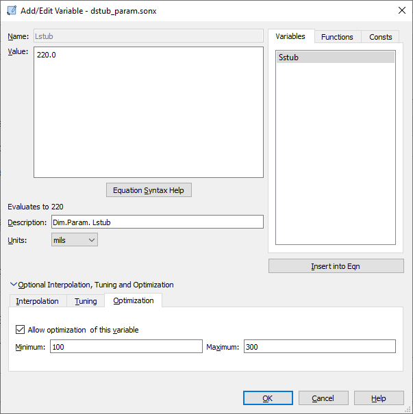 Allow optimization of this variable: Select this checkbox if you wish to be able to use this variable when performing an optimization. When this checkbox is selected, the Minimum and Maximum text entry boxes are enabled. Enter the range of values you wish to allow for the variable during the optimization. For more details, please see the Optimization topic.