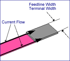 Feedline Width: This defines the Terminal Width as equal to the width of the feedline to which the Co-calibrated port is attached. This is illustrated below. Notice that there is no discontinuity in the current between the feed line and the port.