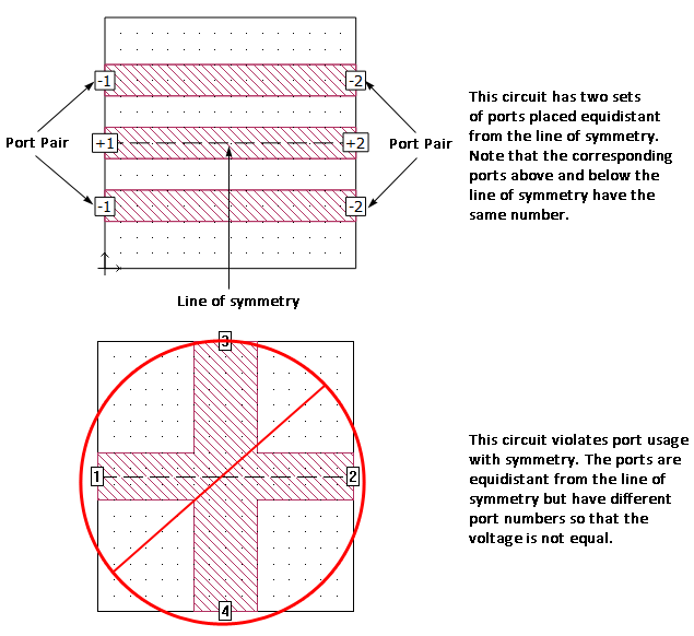 Ports can be placed off the line of symmetry, but the port placed above the line of symmetry must have another port equidistant from and below the line of symmetry. These two ports must also have the same port type, port number and properties. The basic premise of symmetry is that the voltage at any given point above the line of symmetry must be equal to the voltage at the corresponding location below the line of symmetry. Using the same port number, port type and properties ensures that the voltage is the same at both required points.