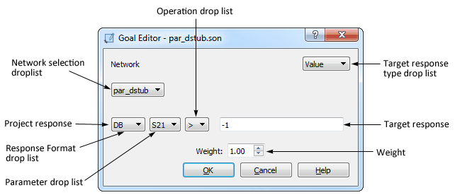 The Goal Editor dialog box is opened when you add or edit a goal entry on the Optimization page of the Circuit Settings dialog box. This dialog box allows you to set up a new optimization goal entry or edit an existing goal entry The goal may be defined in a number of ways which include a user input value, a particular response in another circuit or a particular response in a file.