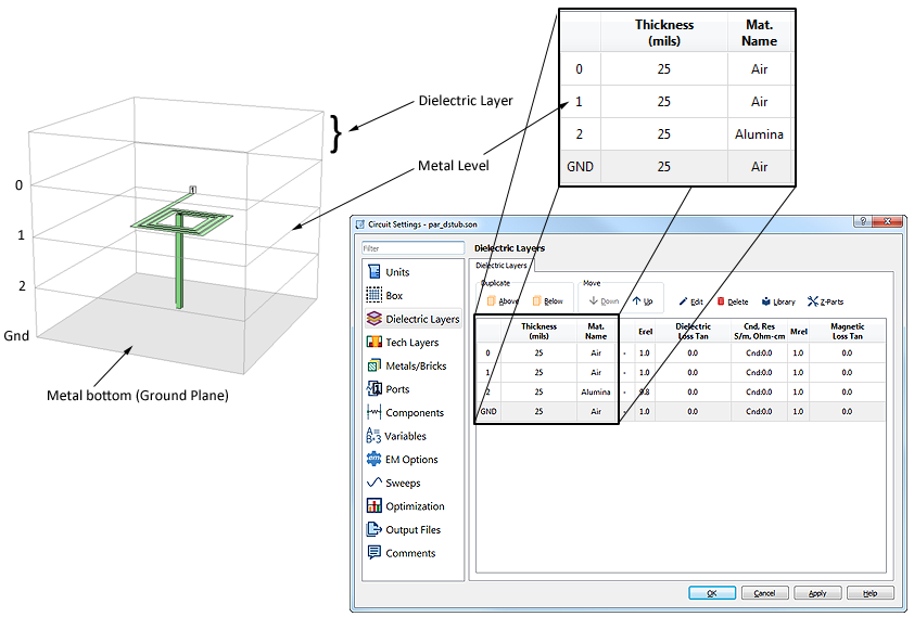 You will use the Dielectric Layers page of the Circuit Settings dialog box Circuit - Settings as shown below, to add dielectrics to your circuit. Each time a new dielectric layer is added, a corresponding metal level is also added to the bottom of the new dielectric layer. You may also add dielectric layers in the Stackup Manager.