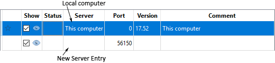 in the Em Server List page. A new entry appears in the server list, with Show selected and the default port number of 56150 entered.