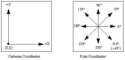 Points may be entered using absolute or relative coordinates. Click on the appropriate button to chose the desired mode. You may not mix absolute coordinates with relative coordinates. You may enter the location as Cartesian or Polar coordinates. The input entry fields are changed depending on the mode.